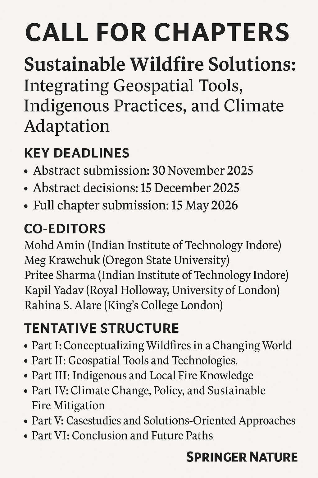 Call for Chapters: Sustainable Wildfire Solutions: Integrating Geospatial Tools, Indigenous Practices, and Climate Adaptation Editor: Mohd Amin (Indian Institute of Technology Indore) – phd2101161005@iiti.ac.in Co-Editors: Prof. Meg Krawchuk (Oregon State University) – meg.krawchuk@oregonstate.edu Prof. Pritee Sharma (Indian Institute of Technology Indore) – psharma@iiti.ac.in Dr Kapil Yadav* (Royal Holloway, University of London) – kapil.yadav@rhul.ac.uk Rahina S. […]
